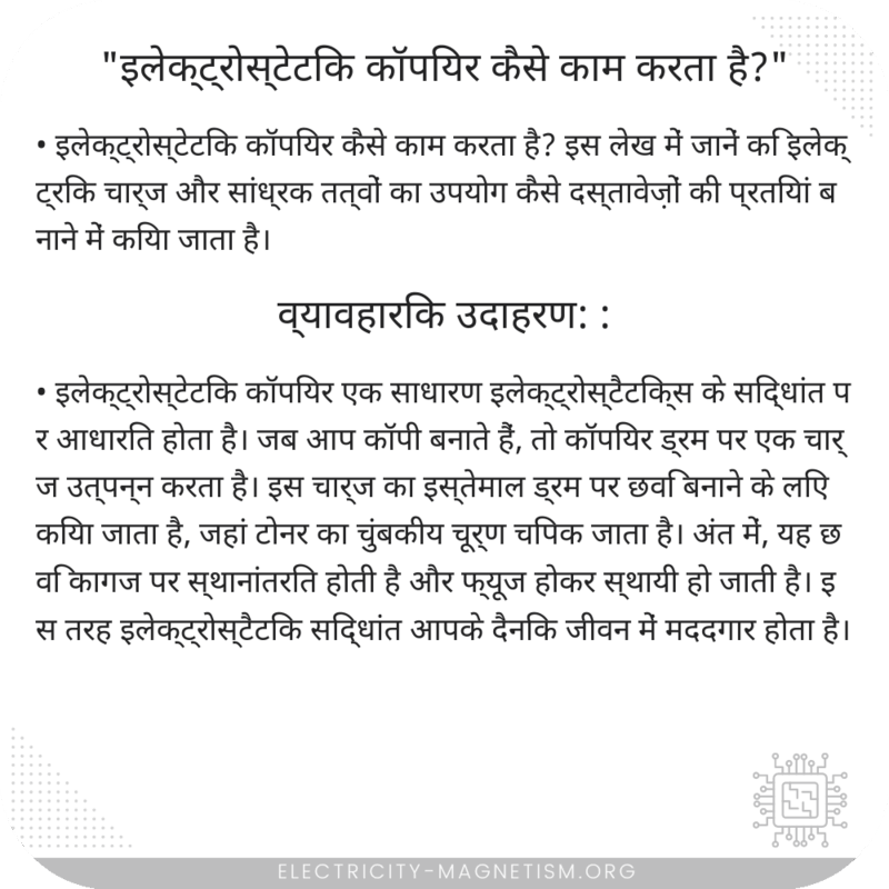 इलेक्ट्रोस्टेटिक कॉपियर कैसे काम करता है? इस लेख में जानें कि इलेक्ट्रिक चार्ज और सांध्रक तत्वों का उपयोग कैसे दस्तावेज़ों की प्रतियां बनाने में किया जाता है।